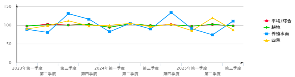 2025年三季度江苏省农村土地经营权(RLPI)为101.9,同比下降0.58%,环比下降1.69%。其中耕地经营权、养殖水面经营权、“四荒”使用权RLPI分别为100.52、95.47、100.72,同比分别下降0.53%、0.3%、7.69%;环比分别下降1.78%,上涨11%,下降12.21%。