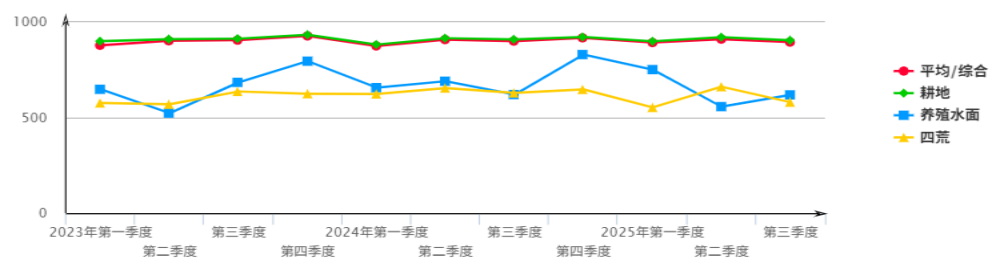 从耕地经营权交易价格走势来看,三季度交易价格为904.8元/年/亩,比去年同期减少4.85元/年/亩,同比下降0.53%,环比下降1.78%。